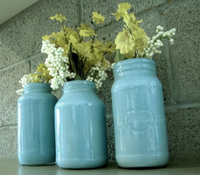 That is all I did.ย It was easy and very economical.ย I purchased some fake flowers at the dollar store and put them in the jars to add a little color, and voila- a beautiful vase!