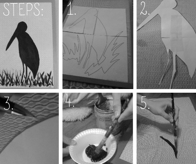 - Print your stencil out. Since my frame is so large, I enlarged my stencil in Paint.net. You can use Photoshop or Gimpshop to do the same thing. I printed it out on to fit on 4 sheets of letter sized paper (see photo below) and taped them together to create the stork outline.