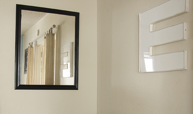 - The mirror was found at Goodwill Outlet. When we purchased it, there were magazine cutouts taped all over it. We cleaned it up with some Goo Gone and spray painted the frame black. Now it goes great with all of our decor.