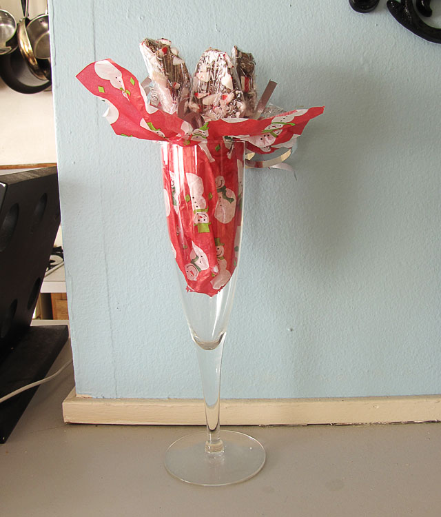 I store my spoons in a glass, wrapped in holiday tissue paper.ย It looks festive, doesn’t it?