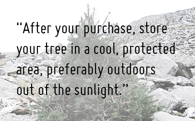 7. After your purchase, store your tree in a cool, protected area, preferably outdoors out of the sunlight. Keep the butt in a pail of water until you are ready to bring it inside to decorate.