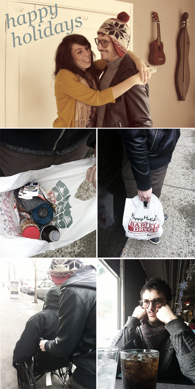 This year, Joey suggested we challenge ourselves to consider the true spirit of Christmas.ย Instead of focusing on the material things associated with Christmas (although we do love gifts), we choose to do something special for the community.ย So we spent our Christmas Eve walking around downtown Seattle doing random acts of kindness.ย ย We used the money that we had saved for stocking stuffers and purchased gifts at a local drugstore.ย We bought bagels, Powerade, energy bars, hats, tissues, and peanuts, among other treats.ย We then walked around downtown offering the gifts to the homeless people we encountered.ย I know it sounds cheesy, but that was one of the best Christmas Eves I have ever had.ย One of the highlights was when Joey helped push a man in a wheelchair up a hill (see photo below).ย He was so grateful.ย We also bought some Chinese takeout and gave it to a man asking for spare change.ย Although I was a concerned that I would miss my stocking stuffers come Christmas morning, I must admit, I didn’t miss a thing.ย I hope everyone is having a great holiday season!