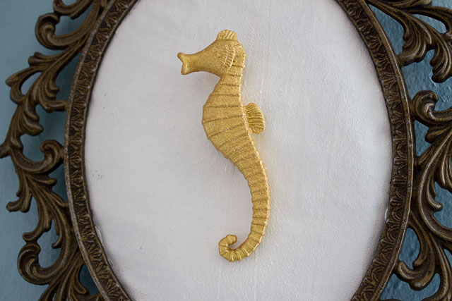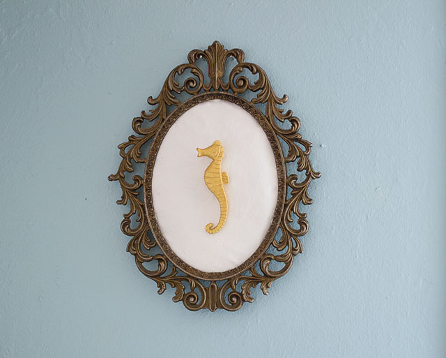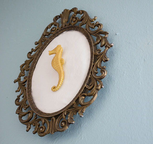 If you think back in time, you may remember that a few months ago I used a thrifted frame, some fabric, and white paint to create a deer silhouette. While that was a fun project, I was starting to get bored with the look. So I decided to change it up and make a relief style art installation. I got my inspiration from a vendor at the Punk Rock Flea Market (a very cool event in Seattle). I basically replicated what the vendor was selling, but with found objects. I recycled the frame, fabric, and white paint from the deer project and added a plastic sea horse toy that I had purchased at the dollar store. First I painted the fabric white to create a solid background. Then I painted the sea horse gold and attached it to the fabric with hot glue. I placed the fabric inside the frame and glued its edges to the frame’s edge.