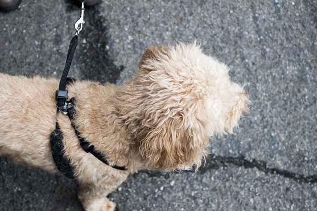 What Zuzu wore: fur (Poodle genes), harness (Petsmart), collar (Petsmart), and leaves/twigs (nature)