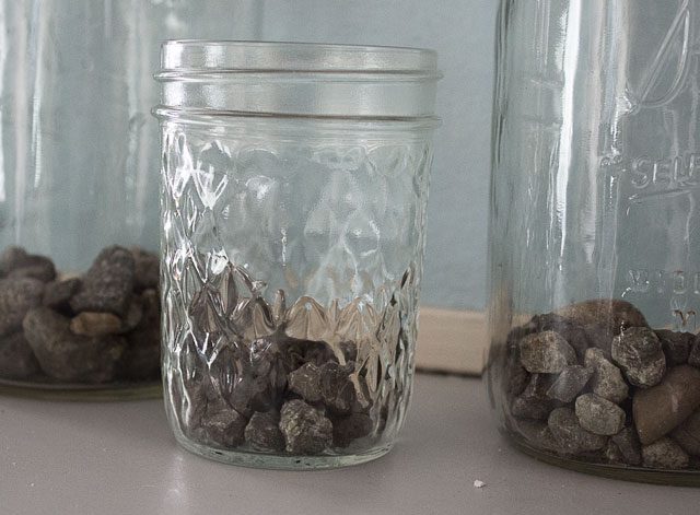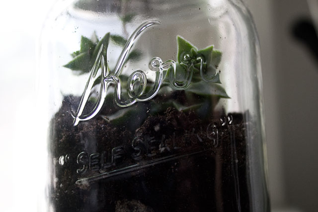 I did some research, and I read that it is very important to fill the bottom of the jar with rocks.ย This allows the water to drain properly.ย Another suggestion was to put a layer of charcoal between the rocks and soil for absorption.ย I purchased some succulents from Home Depot, placed them in the jars, and filled the jars with soil.ย That’s it.ย It was very simple, and I love how it looks.ย The real test will be whether the succulents survive.ย My bet is they won’t make it very long.ย I’ve come to terms with the fact that I’ll never be a master gardener, but lets hope these babies make it at least a few weeks.
