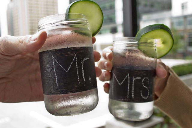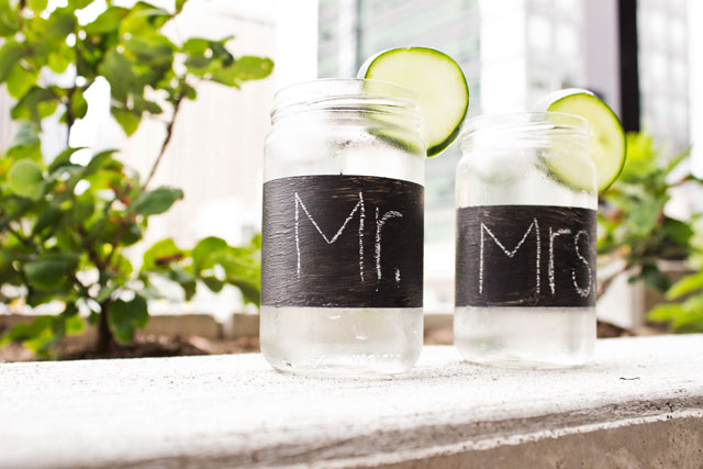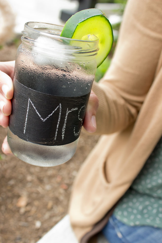 I think this would be an adorable wedding idea.ย Or maybe just for a little party.ย Everyone could write their names on their glasses with chalk and then nobody would get their drinks mixed up.