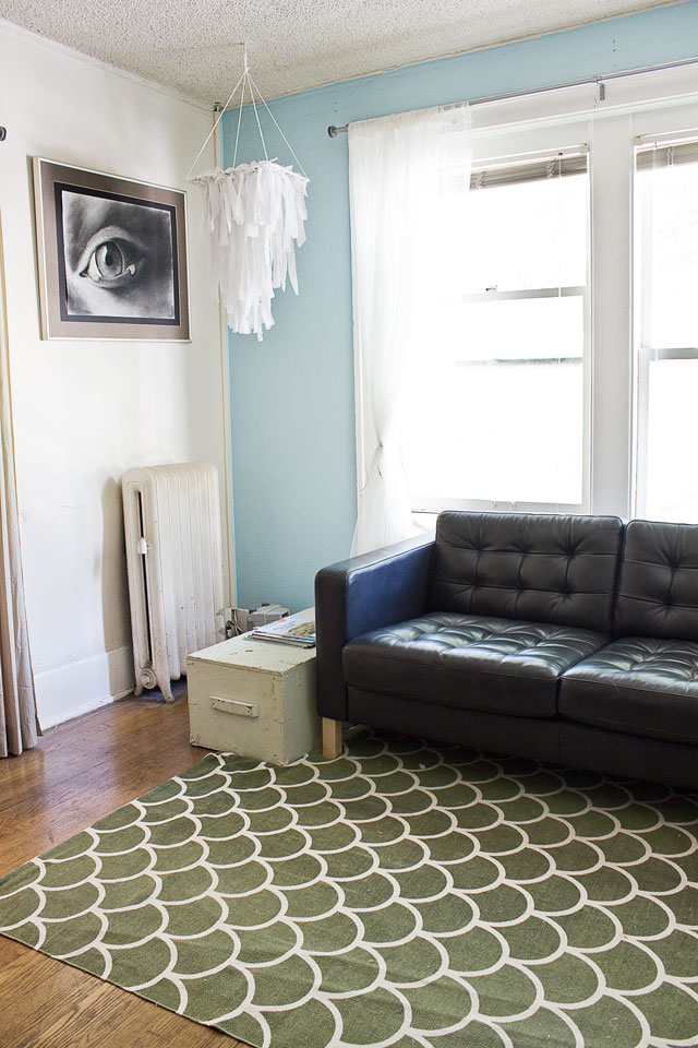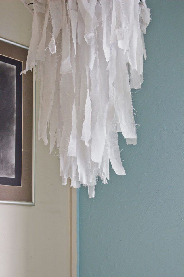 I’m a big fan of lazy diy projects.ย The type of project that takes very little effort and still ends up looking halfway decent.ย With that said, let me introduce you to “The Fabric Chandelier.” This little chandelier is comprised of three materials– fabric, yarn, and a cooking grid.ย I whipped this up one night when I was feeling both creative and terribly lazy at the same time.