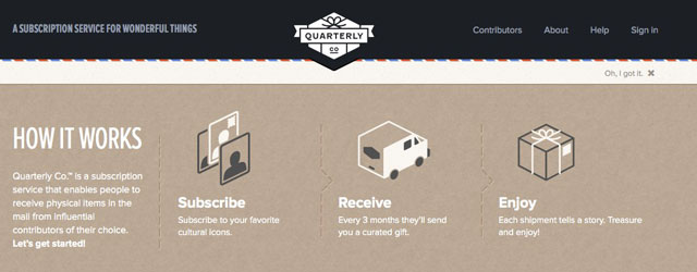 2. Quarterly: Quarterly is a subscription service that connects the subscriber (your gift recipient) with an influential contributor of your choice. Every three months, the subscriber will receive a gift package in the mail that was curated by that contributor. Some of the contributors include the men behind Cool Hunting; Megan Collins from the Style Girlfriend blog; and Alexis Ohanian, the founder of Reddit and Hipmunk.
