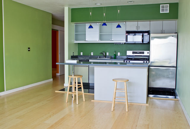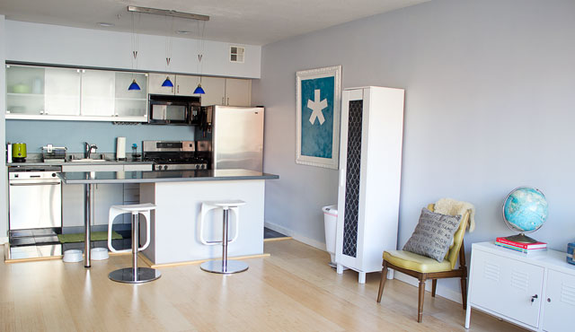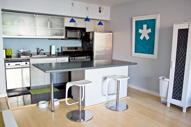 We painted the walls, switched out the stools, hung up some artwork, and called it a day.