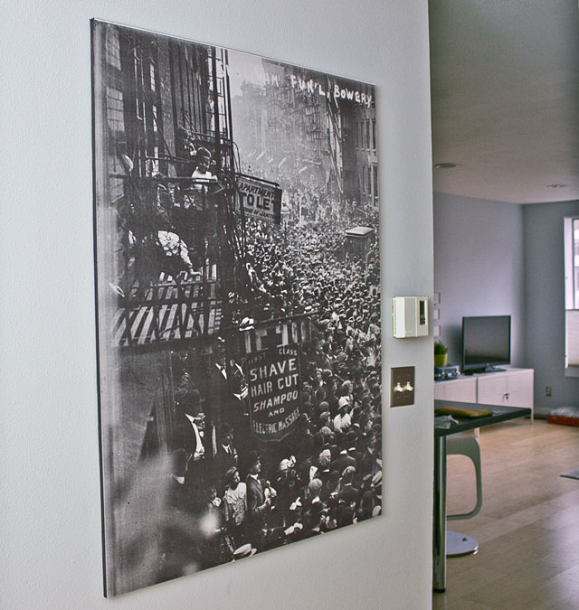Pretty neat, right? If you are curious about what we used to mount the photos, it is actually a funny story. There is a fashion photographer that lives in our building, and he was giving away his photos for free. Anytime there is something free, Joey can’t pass it up. So when he saw the photos, he snatched them up and brought them to our condo. Only problem is, the photos were of scantily clad women. To Joey’s credit, they were mounted on very nice photo boards. I agreed that we could keep the the photo boards, but we had to recover them with better photos. Thus the idea of this project was born.