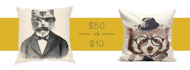 Anthropomorphic animal graphics are everywhere these days, and it’s no surprise.ย Because who doesn’t love looking at adorable creatures like the ones on the pillows below?ย I can’t help but smile when I look at them…a bespectacled raccoon and a mustached cat.ย I love them both, and either pillow would look pretty amazing on my couch; however one costs a mere $10, while the other is 5 times more expensive.