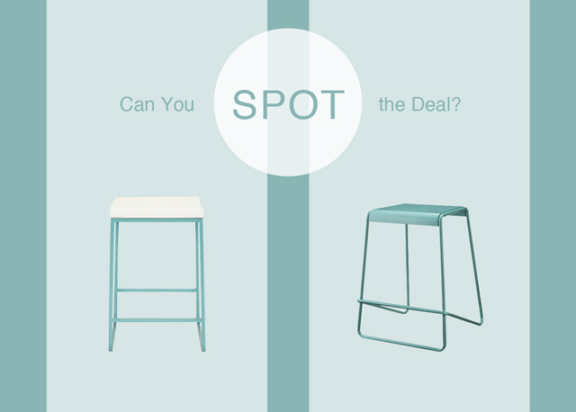 I’ll give you a hint–the stool on the left retails for $269 at Room & Board.ย I don’t know about you, but $269 for a single stool seems a little step to me.ย Granted, the Collins stool is a beautiful piece of furniture, but I wouldn’t feel comfortable spending that much money.ย A much more affordable option is the Too by Blu Dot Plop Counter Stool, which is pictured on the right.ย It can be purchased from Target’s website for only $48. That’s what I call a deal!