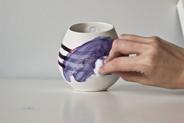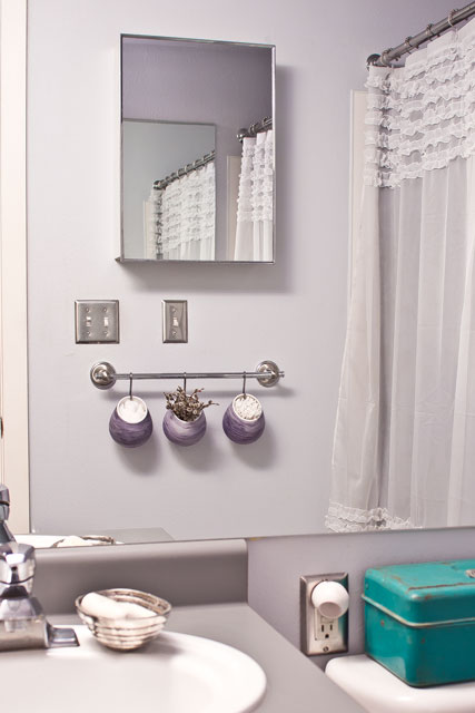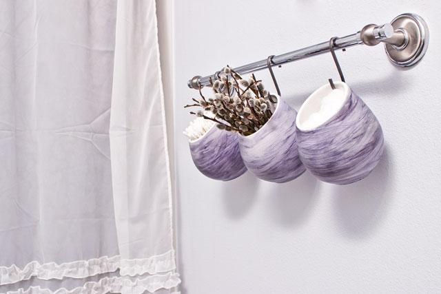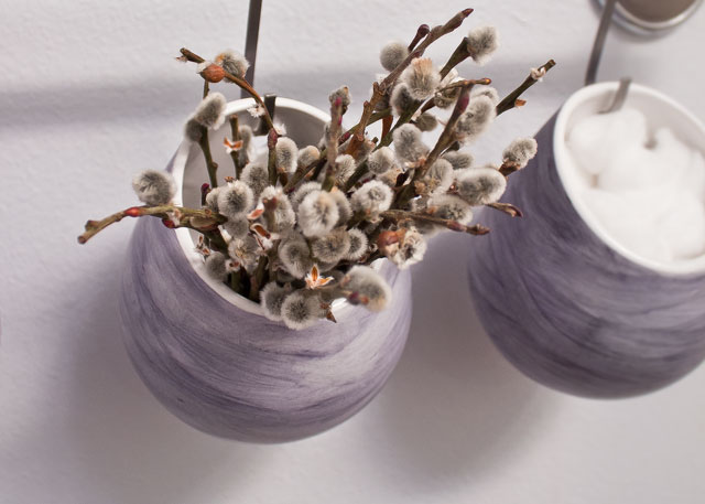 The unique stroke pattern comes from the use of a cotton ball as my paintbrush. I rubbed the cotton ball horizontally, back and forth, until I was happy with the effect. I was a pleasantly surprised that the diluted Sharpie became a purplish gray color, because it actually matches our bathroom’s color palette.