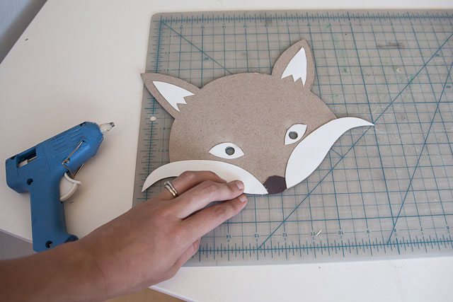 After cutting out the mask base, I traced and cut out all of the other pieces from construction paper. Then I hot glued those pieces onto mask base. I was very careful to check that the eyes were in the right location before gluing them on and cutting out circles to see through.