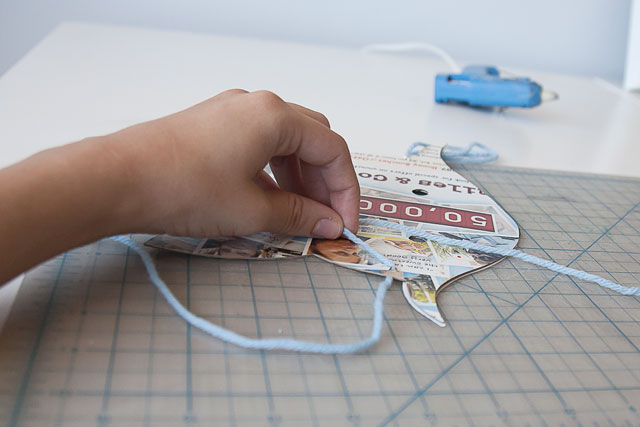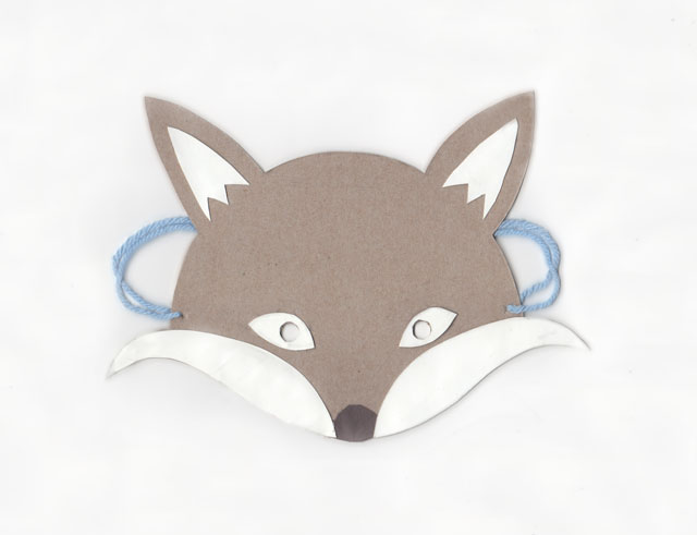Once the hot glue had dried, I cut two small holes on the sides of the mask.ย Then I strung a piece of yarn through each hole.