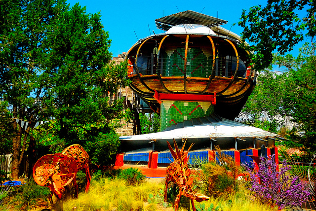 Another architect that has led the experimental architectural movement in Albuquerque is Bart Prince.ย His home, shown below, is a great example of his progressive work. When it was built in the 1970s, it was somewhat controversial in the local architecture community; however as the years went on, people began to appreciate the home’s unique identity and its otherworldly beauty.