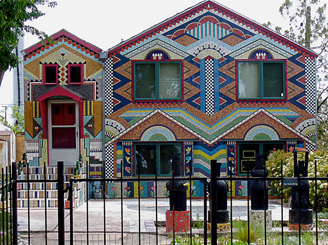 More recently, design in Albuquerque has become increasingly experimental.ย A great example is the tile house, shown below, by Beverly Magennis.ย She started this project in 1984, and it took her 11 years to complete. The details are amazingly intricate, so it isn’t surprising that it took so long to complete.ย It’s a beautiful home, and I love that the pattern is inspired by Albuquerque’s Native American roots.