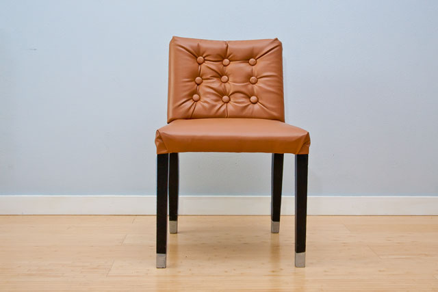 I tried three different fabrics before settling on this faux leather that I got at Zero Landfill for FREE! The only things I had to buy for the project was an upholstery needle and a craft button cover kit. I also used some silver paint to give the legs a little pizazz.