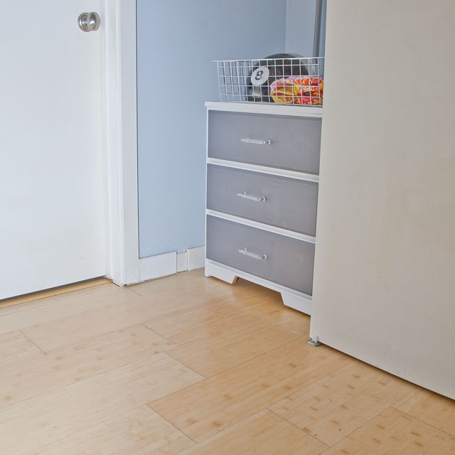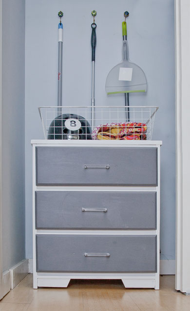 Maybe I’m a little weird to be putting a dresser in a closet, when I could just as easily close the closet door and ignore the mess; however, I’m kind of a neat freak, so having an organized closet makes me so, so, so happy. I even installed some cute little hooks to hang my broom and mops. It’s all very orderly.
