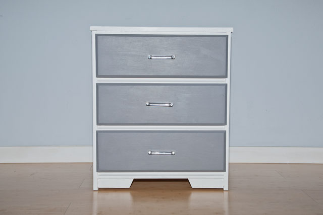 Before doing anything else, I sanded and cleaned it. Then I removed the drawers and painted them gray. I installed 3 Ikea SÄTTA handles for the drawer pulls. As a finishing touch, I re-painted the dresser’s body. It was a very simple makeover, but I think it made a world of difference.