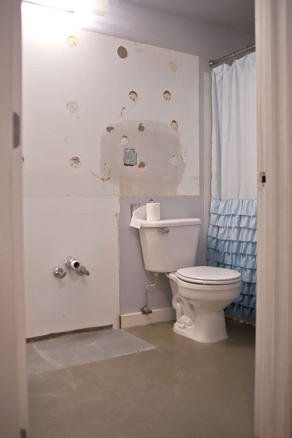 So the first step in our bathroom renovation was what I like to call the “demo” stage.ย We didn’t actually demo anything, but it sounds cooler than the “remove the vanity/mirror” stage.ย The space looks so much bigger without the bulky vanity, wouldn’t you agree?