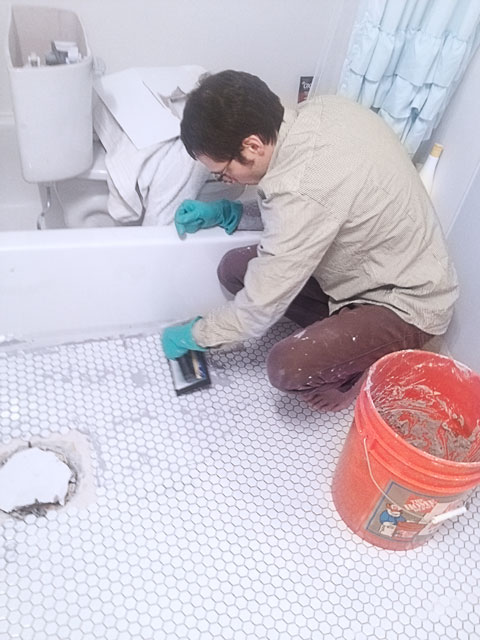 The next day, we began the grouting process. The hardest part of the process was mixing the dang grout… the instructions said to stir continuously for 5 minutes — 5 minutes is a long time, so I think we cheated a little and only mixed for about 2-3 minutes. Then we started grouting. We had a nice little process going. Joey would spread the grout and I would follow him and sponge off the excess grout. I also took a lot of breaks to drink water, watch Netflix, play with Zuzu, etc… Joey wasn’t so jazzed with my apparent lack of dedication. But honestly, there wasn’t much for me to do. We only had one grout float, so it was pretty much a one man job.
