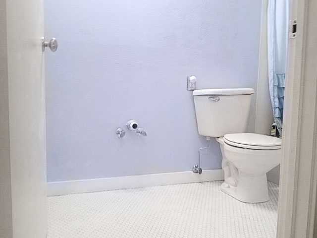 We first laid the tile out to figure out the best layout Then Joey used a tile cutter to make the necessary cuts. The next morning, we took the baseboards and toilet off, spread the thin set mortar and placed the tile. We had to let the mortar dry for 24 hours, which was a HUGE pain because we only have one bathroom. Not having a toilet is really hard. Luckily, we have some friends that live in the building next to us. They let us use their bathroom while we waited for the mortar to cure.