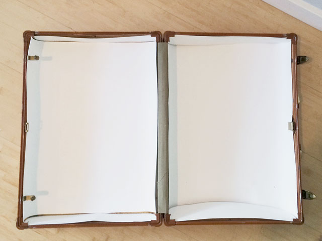After disinfecting it, I tore out the inner lining. I spent a lot of time figuring how to re-line it.ย In the end, I decided to use poster board as a backing.ย I cut the poster board into strips, as shown below.
