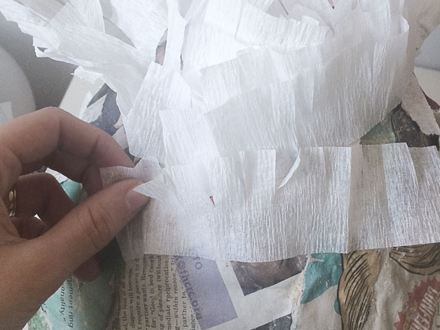 9. Use a hot glue gun to glue the unfringed edge of the streamer to the paper mache body. Start with the arms and legs before moving from the bottom up. It’s easiest to turn the body upside down to glue the bottom half.