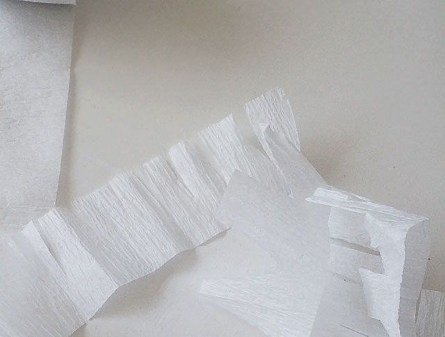 8. Now it’s time to decorate! Take the crepe paper streamer and begin making small fringed incisions. It’s best to unroll a long strand of the streamer, and then fold it over several times before making the cut. That way you can cut multiple incisions all at once.