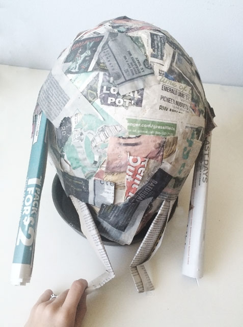 5. Make arms and legs by rolling up 4 sheets of newspaper. Using hot glue, affix the arms and legs to the balloon. It will end up looking sort of like a Thanksgiving turkey. To make sure the arms and legs stay attached, I suggest adding anther layer of paper mache over the joints.