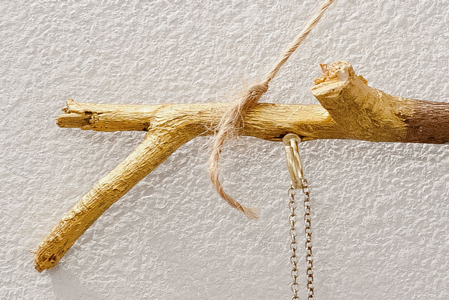 4. To hang the branch, tie a piece of twine to opposite sides of the branch.ย Screw the 5th cup hook into the wall where you intend to display the jewelery.ย Then wrap the center of the twine around the hook.