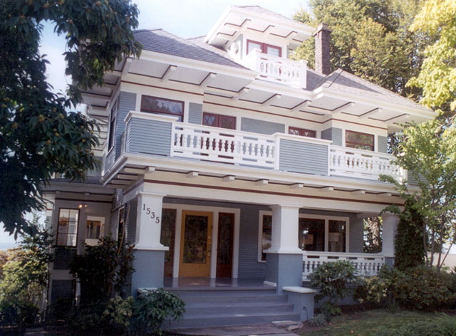 Let’s start with the Queen Anne. I love the Queen Anne style. These decedent homes are abundant in Seattle’s oldest neighborhoods, such as, you guessed it… Queen Anne. They typically feature intricate molding, front facing gables, scalloped siding on the upper level, and a tower.