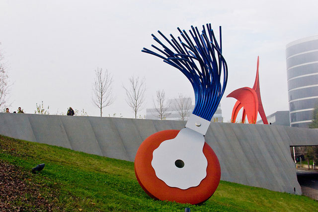 I like that Seattle, like other large cities, does have this simple style of pop art that plays with scale: Catherine Mayer’s Giant Popsicle sculpture in Belltown, Claes Oldenburg’s typewriter eraser in Olympic Sculpture Park (see below), the upturned umbrella near Pike’s Market, the bouncing paddle ball outside a gaming company’s headquarters, etc. But this passively mingles with the city landscapes and never enters the home.