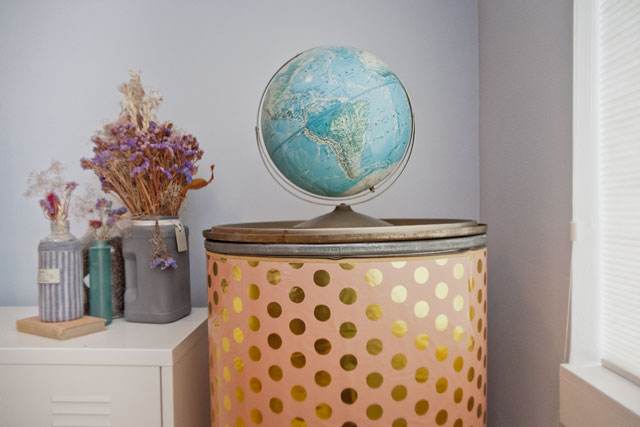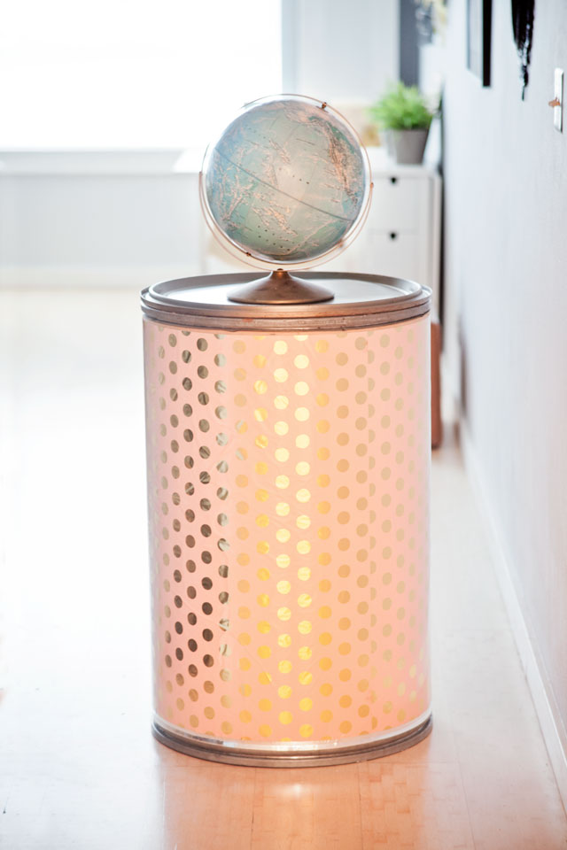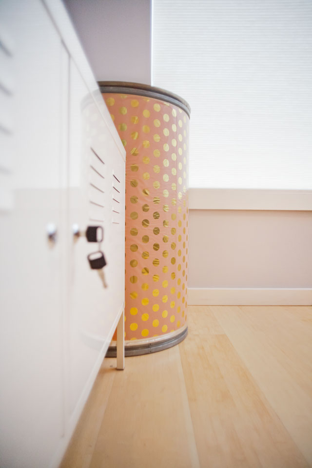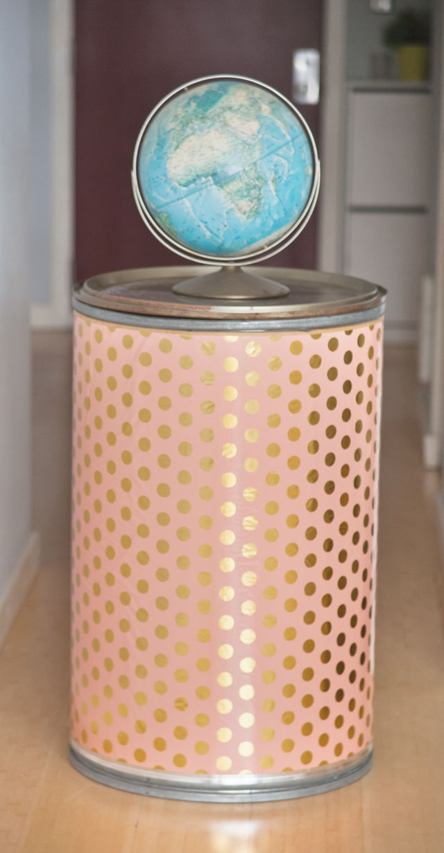 We sprayed the wrapping paper with adhesive and covered the barrel. It was a challenge to get the paper to stick smoothly without any creases because the wrapping paper was flimsy thin. It took a bit of time to press the paper to the barrel so that it lined up and did end up with a few creases anyway. Still, I like the presence it brings to the room, with a flavor not unlike a Campbell’s Soup can blown up and given a three-dimensional body.