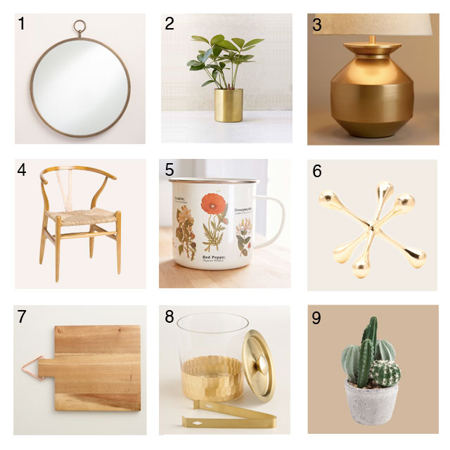 1. Brass Metal Loop Mirror; 2. Small Mod Metal Planter; 3. Gold Table Lamp; 4. Wishbone Chair; 5. Botanical Mug; 6. Gold Jack; 7. Wood Cutting Board 8. Gold Metal and Glass Ice Bucket; 9. Cactus Garden
