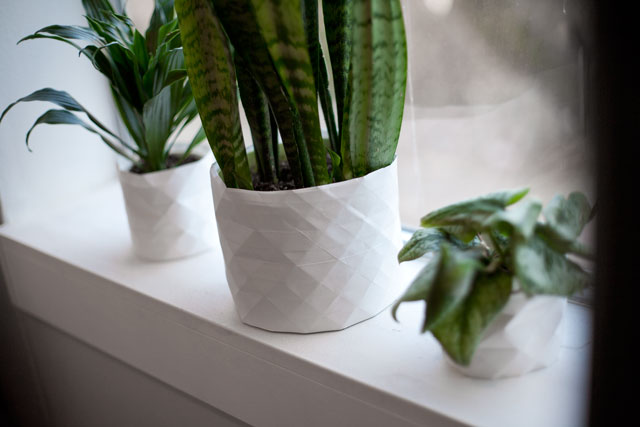 Today I’m sharing a tutorial for making inexpensive, geometric paper covers for planters. What I love about these covers is they erase the need to re-pot your plants from the plastic containers they come in. You can just wrap the planter in these covers, and they’ll look beautiful.