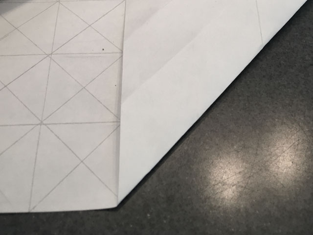 The next step is to arrange the paper in landscape position and draw an additional horizontal line through the center of each square. Then begin folding the paper horizontally along the straight lines. Be sure to fold in an outward fashion, so the pencil marks are visible.ย When done, unfolded the paper and begin folding inward along one set of diagonal lines. As you can tell from the photo below, this is actually a bit difficult because the pencil marks will be hidden as you fold. After folding all of the the diagonal lines one direction, fold the opposite diagonals in the same fashion.