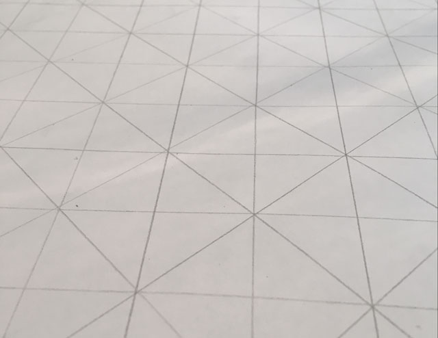 To begin, you’ll need a large piece of thick paper. I used a piece of paper from one of Joey’s 18″ x 24″ sketch pads. It’s thicker than regular paper, but less thick than poster board. This size covered a 6″ plant and a couple of 2″ plants with plenty of leftovers.ย The first step is to draw a 1″x1″ grid on the paper. Then intersect the grid with diagonal lines to create a crisscross pattern, as seen below.