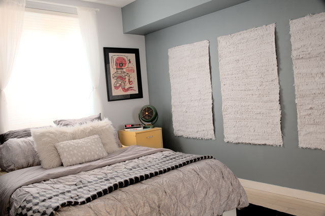I’m going to share an embarrassing fact about myself. About a year ago, I was dead set on starting pinata making business on the side. I bought all the supplies to start my business, but then I realized something, making pinatas is very time consuming. It’s also not super easy to do.ย I have a full time job. I barely have time to take care of Zuzu and Joey, let alone start a side business. So I put the kibosh on the whole business idea; however, I still had a ton of white streamers that I had intended to use for the pinatas.ย This weekend, I decided to put them to good use, and I made some really fun wall panels that are hanging in my room. So I guess something good came out of the whole ordeal.