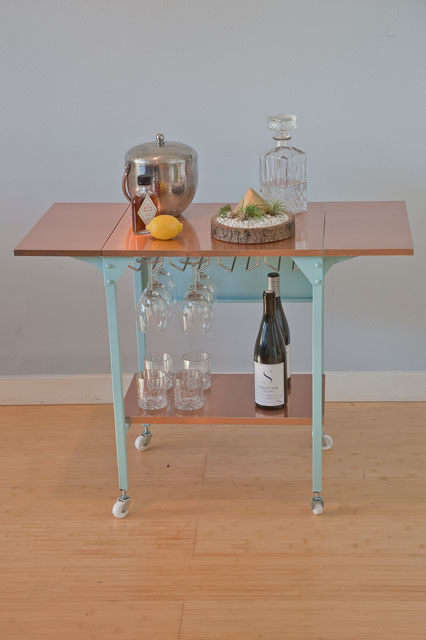 It had potential, but needed a few tweaks. First, I replaced the clunky black wheels with smaller white ones and painted the frame blue. Then I got a free piece of scrap wood from Home Depot and had it cut to fit the bottom ledge and create a new shelf. The biggest change was covering the faux wood top with metallic contact paper. As a finishing touch, I added an under the shelf wine glass holder.