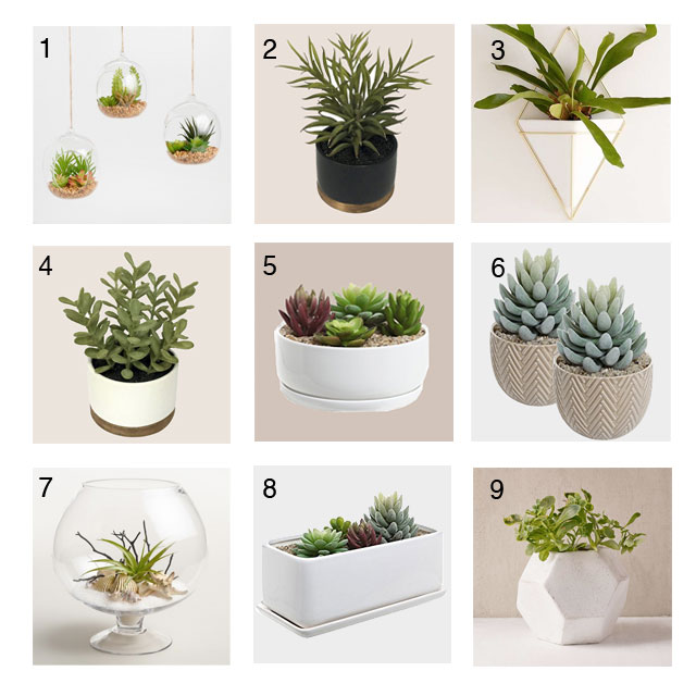 1. Glass Globe Succulents; 2. Black Planter; 3. Triangle Wall Planter; 4. White Planter; 5. Round Succulent Planter; 6. Beige Ceramic Planters; 7. Glass Terrarium; 8. Rectangle Window Box Planter;9. Concrete Geometric Planter