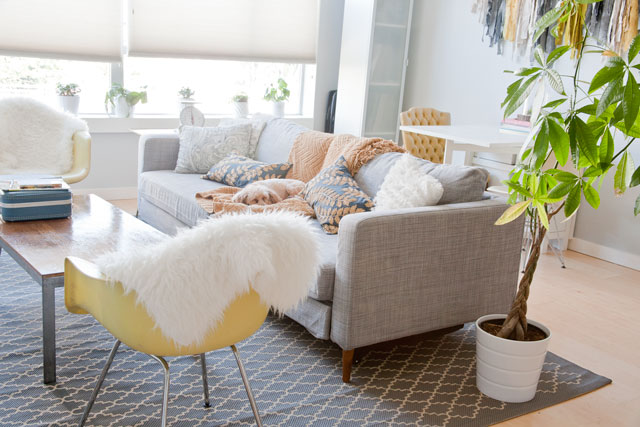 As far as the couch, you may recognize it from our office/guest bedroom. It’s the Ikea Karlstad sleeper sofa, and it looks quite lovely in the living room, wouldn’t you agree? Zuzu is a fan. She likes to sleep on it and soak up some sun from the windows. We are going shopping this weekend to find a replacement sleeping option for the office/guest bedroom. I’ll be sure to share photos of what we find.