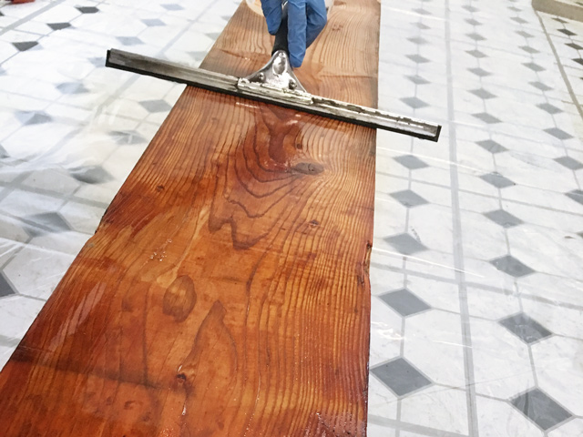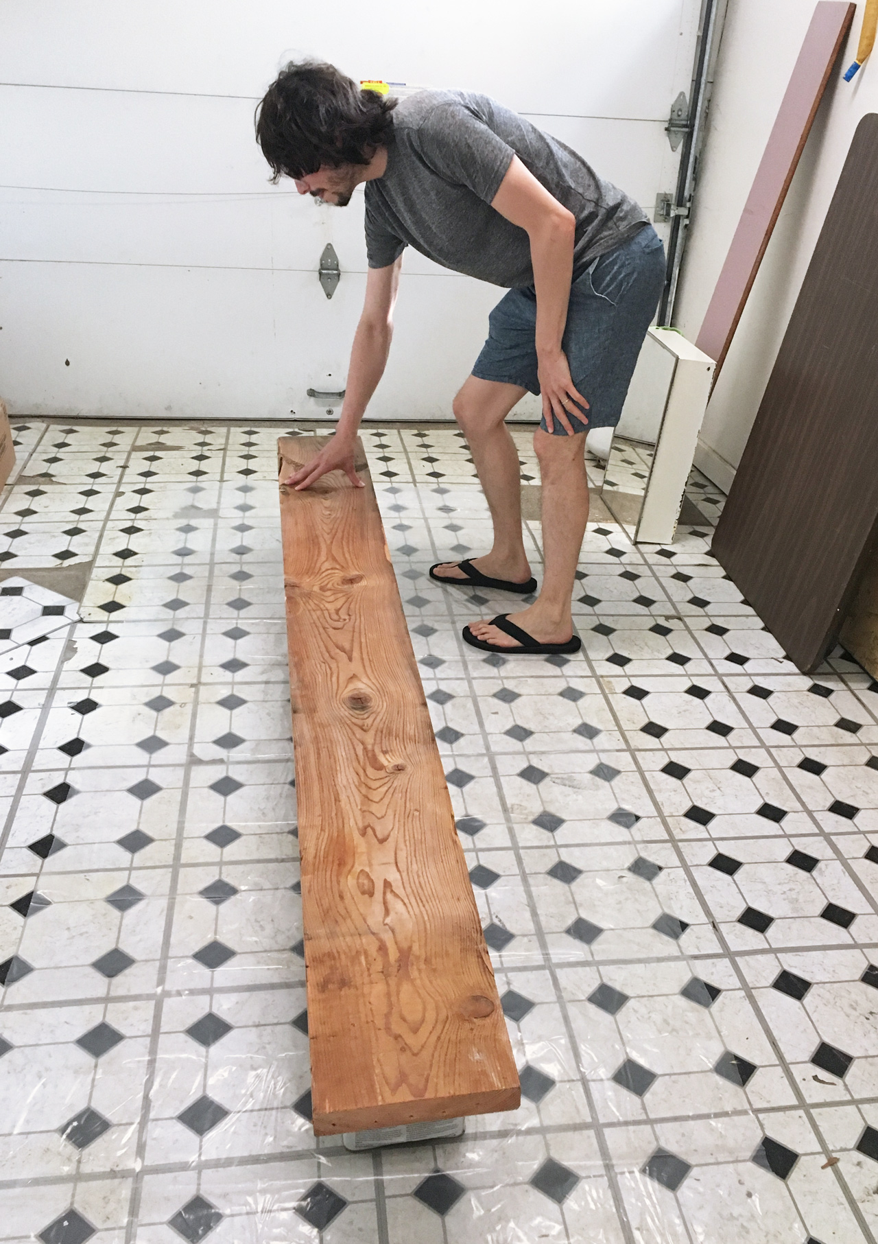 Since the space that I wanted the bench to sit has a narrow walkway, I couldn’t buy a pre-existing bench. Instead I had to design something custom made. I ended up buying the wood from Ballard Reuse, an architectural salvage shop in Seattle that I frequent on occasion.ย It was a steal at only $10. The only problem is that the wood wasn’t in the greatest shape and Joey was concerned about the possibility of splinters when our baby starts crawling/walking (#superdad). He tried sanding it, but it was still splinter city,ย so we decided to cover it in a very thick coat of epoxy resin.ย This was the most time consuming part of the project. We did two coats on each side and it takes FOREVER to dry.ย You also have to watch it very carefully while it dries and immediately blow out any potential air bubbles.