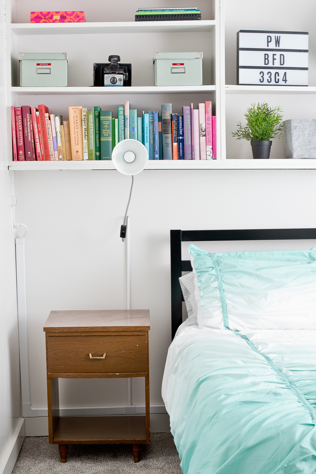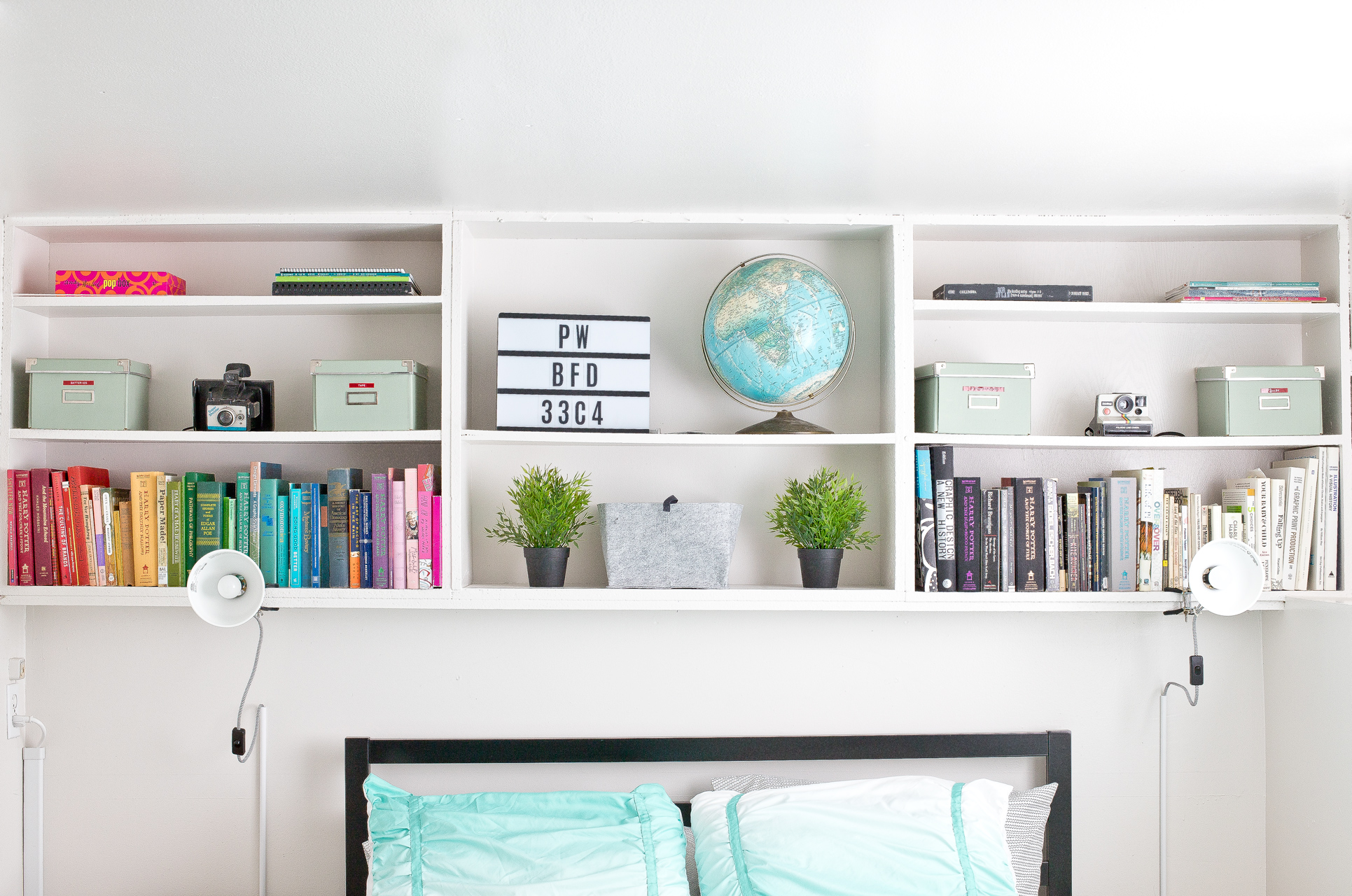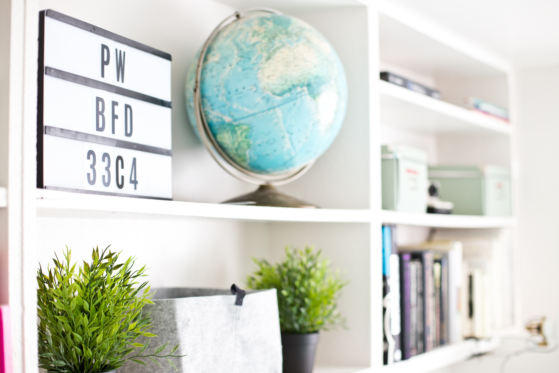 I spent a lot of time arranging my books and knickknacks to make it both visually appealing and practical. For instance, I used a message board for the wifi password so our guests have it handy. I’ve used some inexpensive Ikea Ranarp Clamp Spotlights as extra lighting. They are a bit quirky, but I like them. Joey installed cord hiders to keep the cords tidily managed.