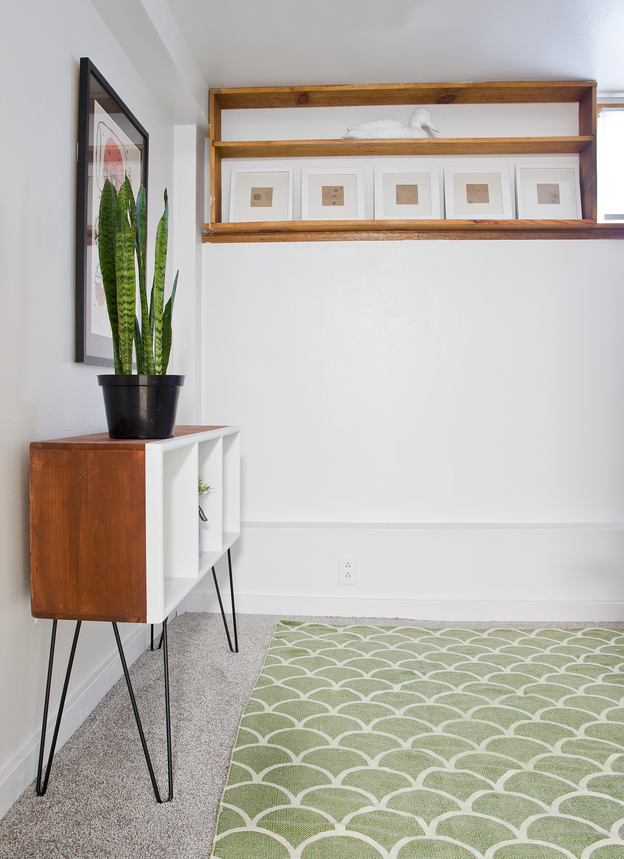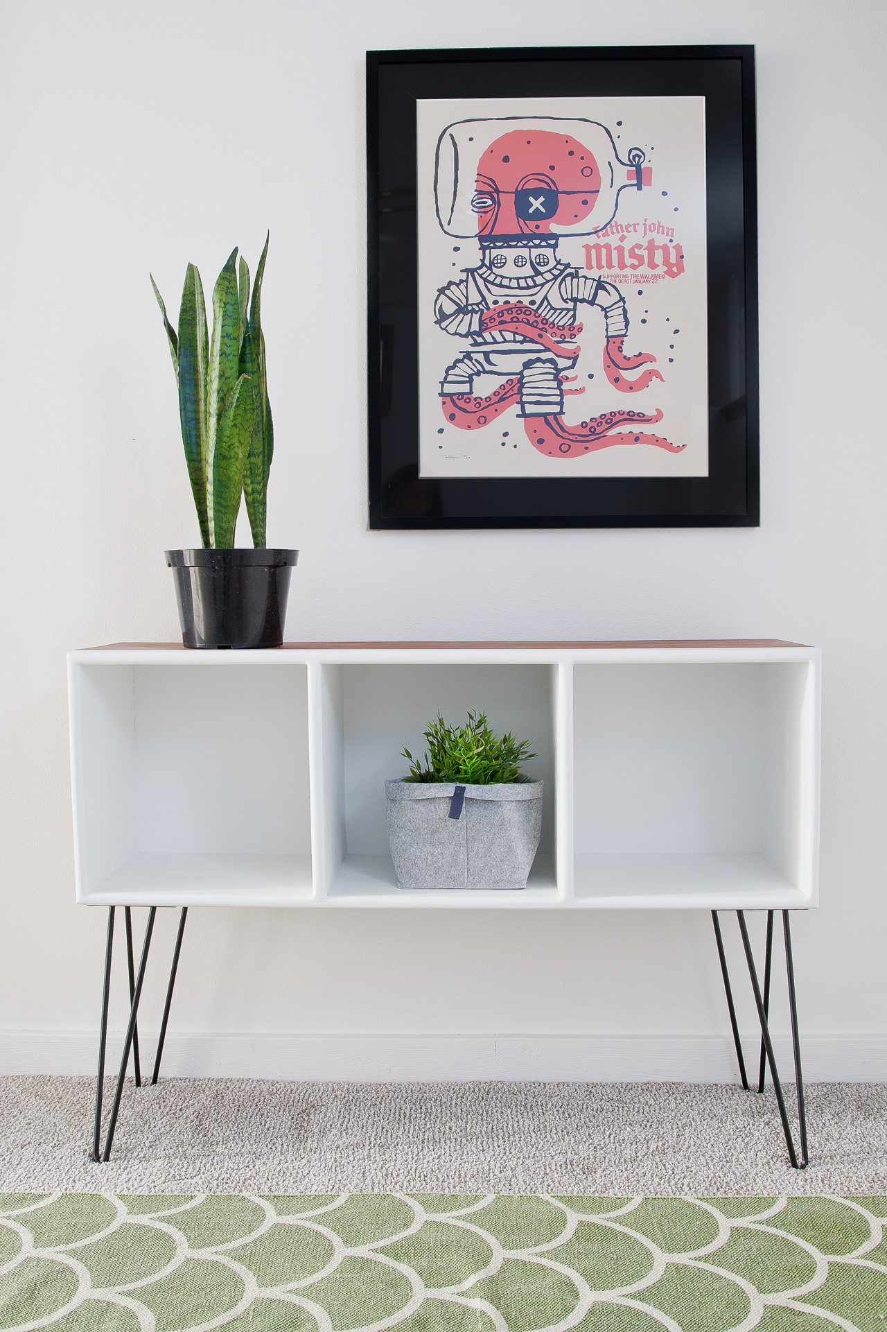 Side note – isn’t the flooring on my garage pretty amazing? It’s not in very good shape, and I have no idea why someone thought that type of flooring was appropriate for a garage, but I love it irregardless. Anyways, back to the makeover. We decided to flip the bookshelf on it’s side, add some hairpin legs, and remove the nasty purple paint. Sounds easy, right? Well, not exactly. The paint was really hard to strip off. I spent a solid afternoon trying to remove the layers of purple using Citri-Strip. Eventually, I gave up and took out my electric sander. I got the outside looking great, but I couldn’t get the purple paint removed from the inner corners, so I made an executive decision to paint the inside white. Fortunately, I really love the look with the white paint.