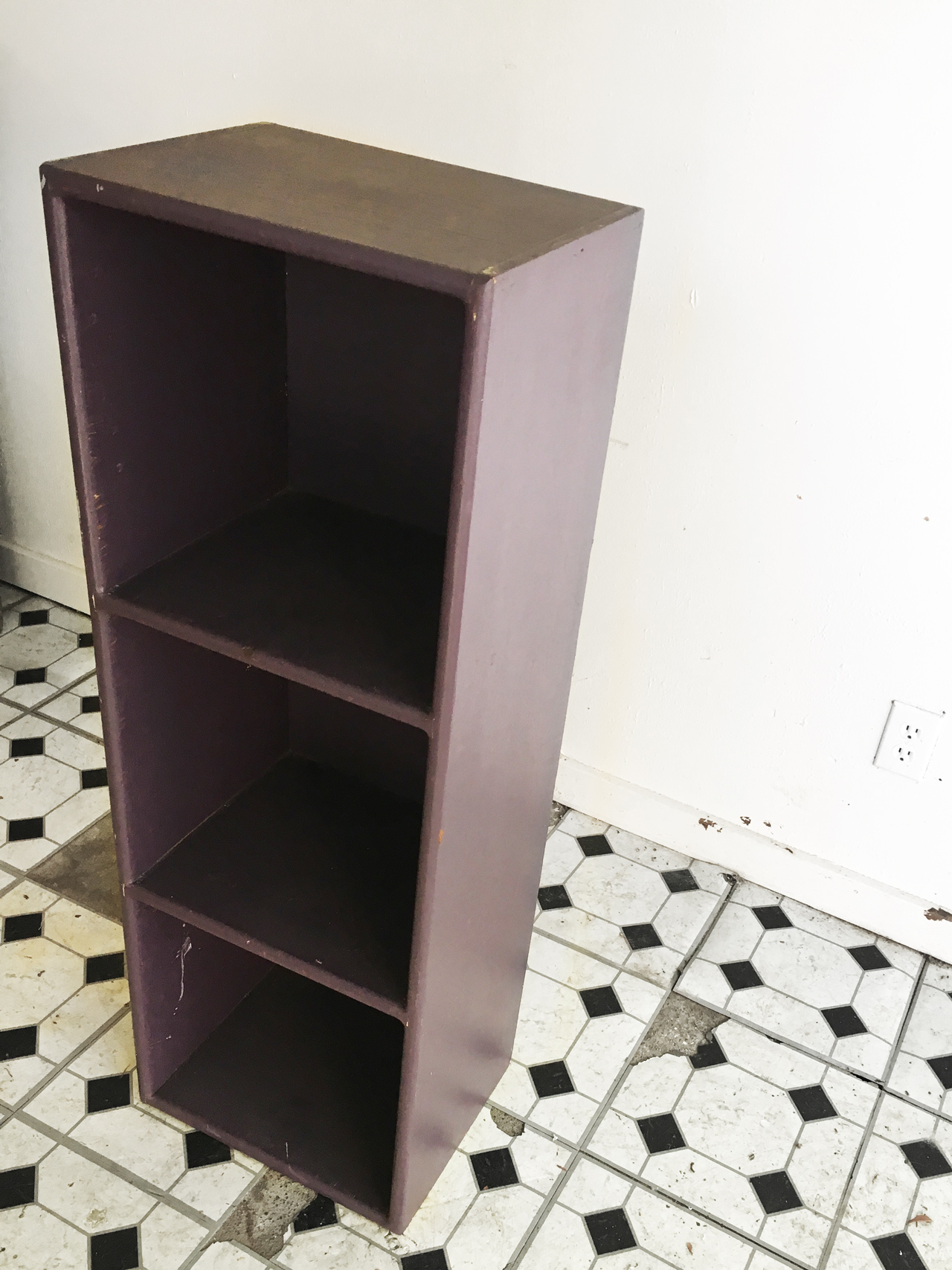 Last summer, I was at my favorite store, Goodwill Outlet, and I saw this sad little purple bookshelf / cubby holder. I was searching for a cheap credenza for one of our basement guest bedrooms, and I thought to myself, “Kathryn, maybe this is the credenza of your dreams.” The logical side of my brain said, “No, that is a piece of crap,” but the creative side said, “buy it and see if it can be made over. It’s only $1.99.” That’s the joy of Goodwill Outlet. With prices so low, there is honestly no reason not to buy something you are on the fence about. So I bought it. Then I enlisted Joey to help me brainstorm how we could make it into a credenza. Here is the before.