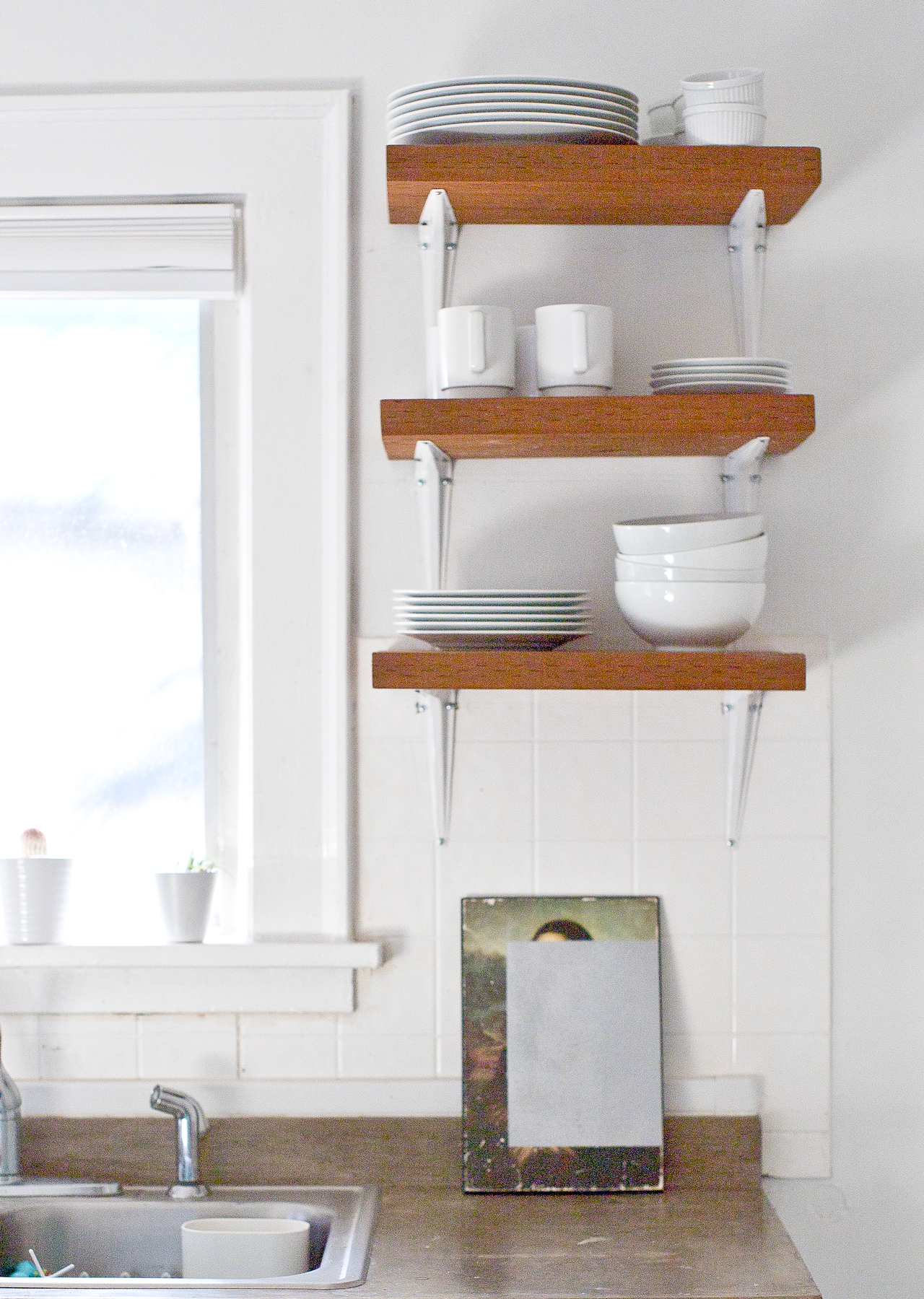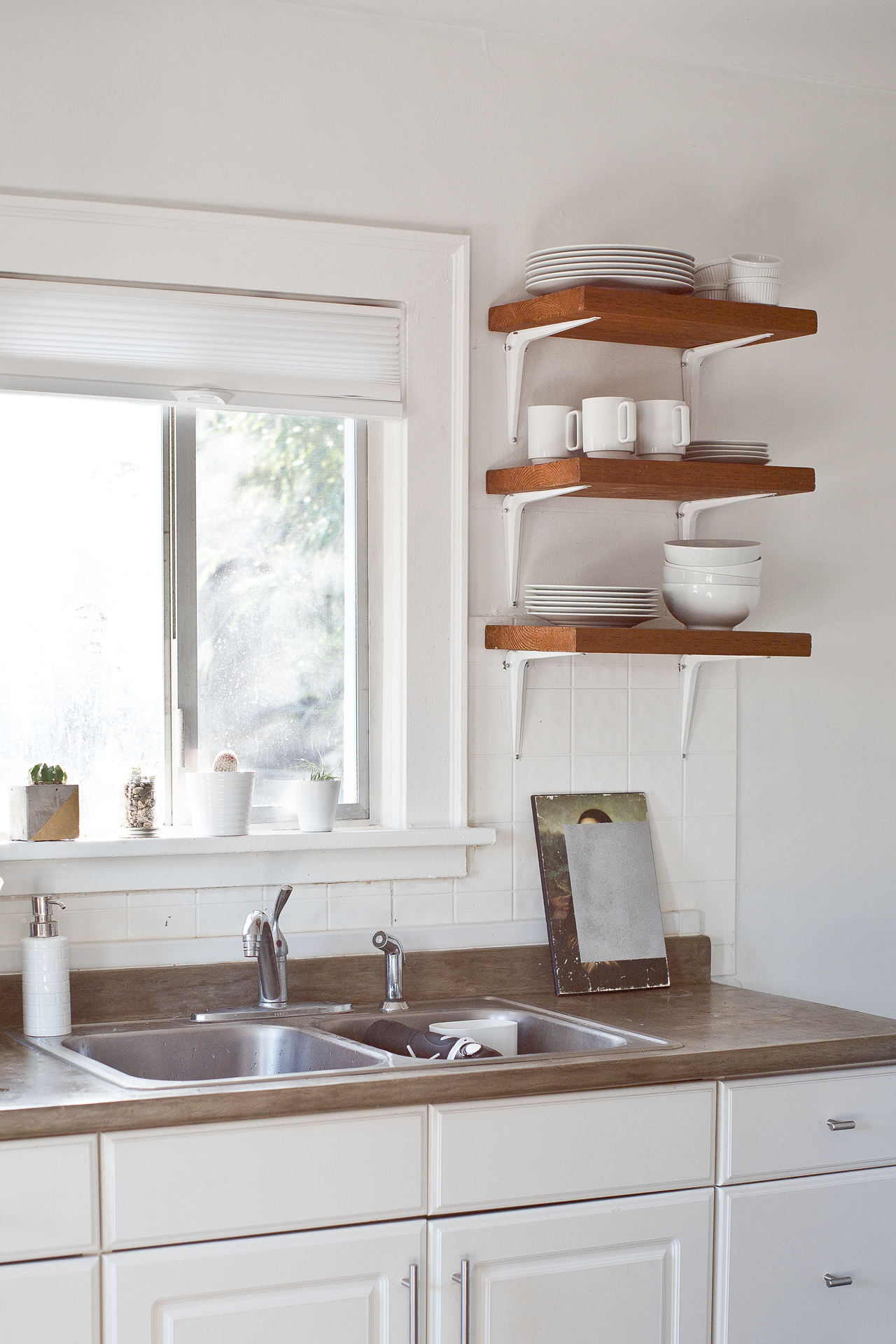 First up, our kitchen.ย One day I will do a full kitchen tour, but for now, I’m going to show you these awesome shelves I made. I’m so, so, so in love with the open shelving trend. Unfortunately, my cabinets are full of brightly colored sippy cups that are not display worthy. So instead of taking the plunge and making all my upper cabinets sans doors, I just added a section of open shelving in this weird dead space to the right of our sink.