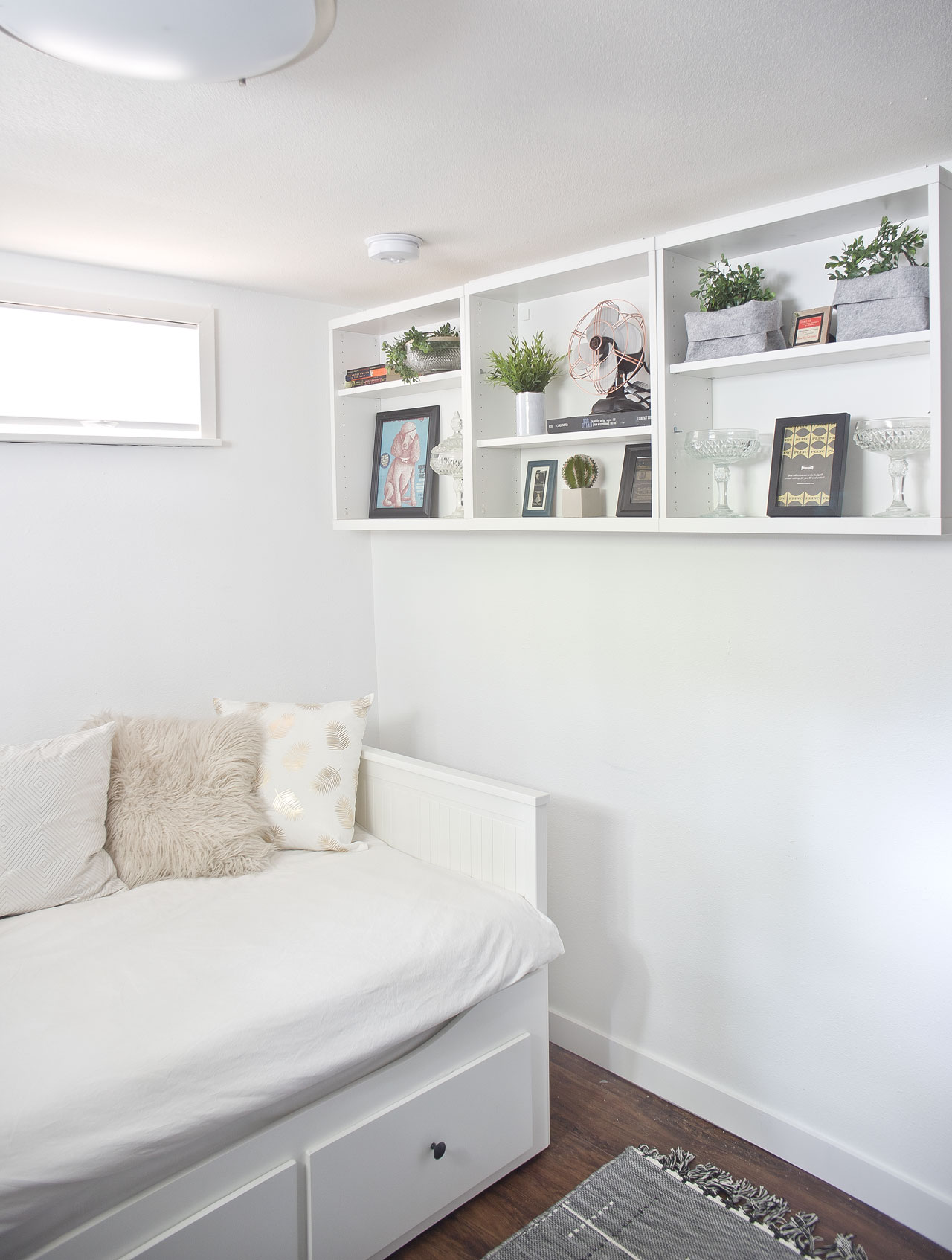 Instead of trying to cram a queen bed in the room, we decided to use an Ikea Hemnes daybed. It’s the perfect fit and when it is opened up, it’s actually quite large. It also is multi-functional and doubles as seating while watching TV. We moved our one and only television to this room because we weren’t really using it upstairs and it was a bit of an eyesore over our fireplace. So it was banished to the basement. The shelves are also from Ikea. They are from the Besta line.
