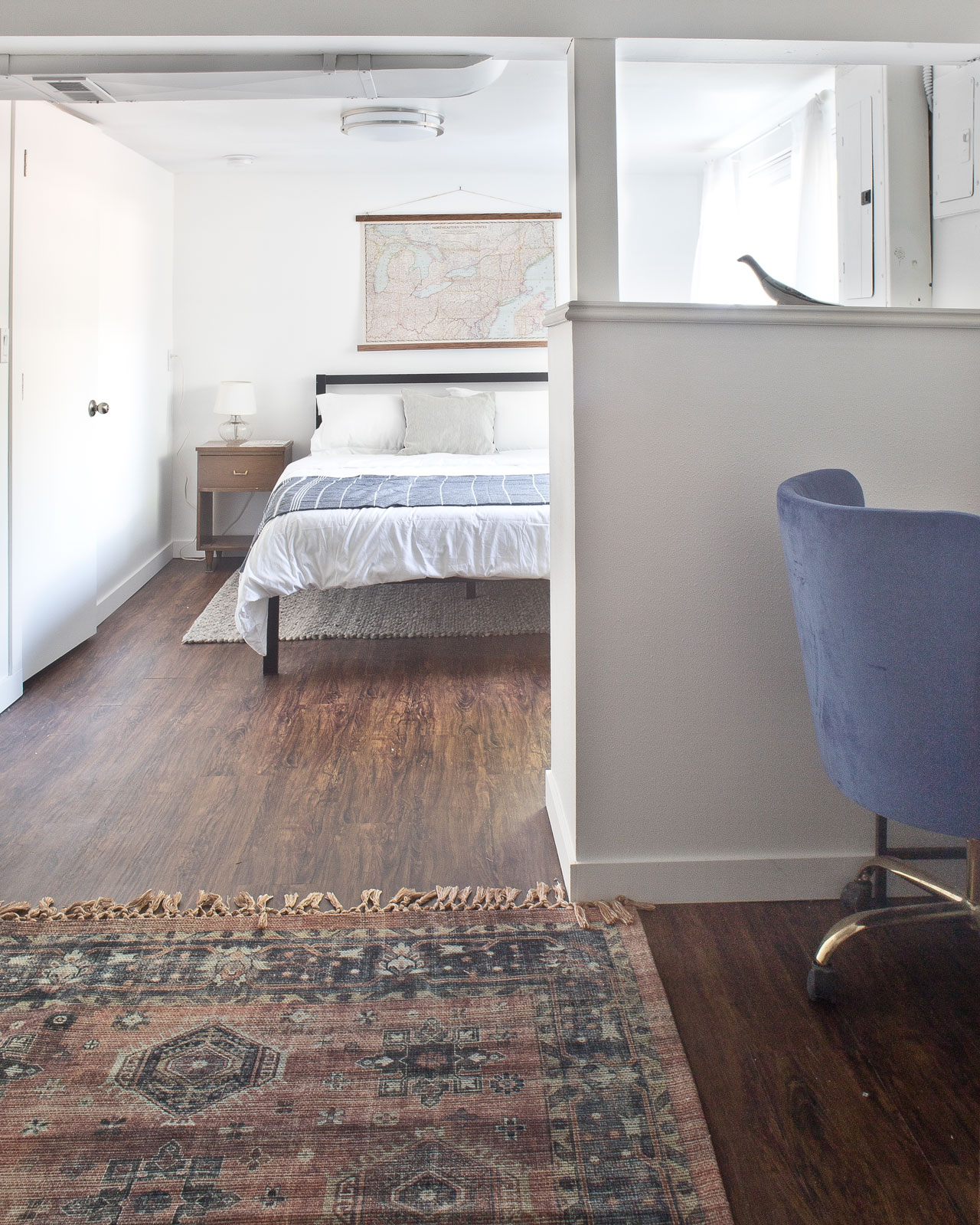 I also have a blue rug that I keep moving around. For some reason, I never like where it ends up. It started in Florence’s room. Then I moved it to the large guest bedroom in our basement, and now it’s in my crafting space in the attic. In the basement, I replaced it with the muted pink rug that you can see in the corner of the photo below. Florence’s room has an almost identical rug now.
